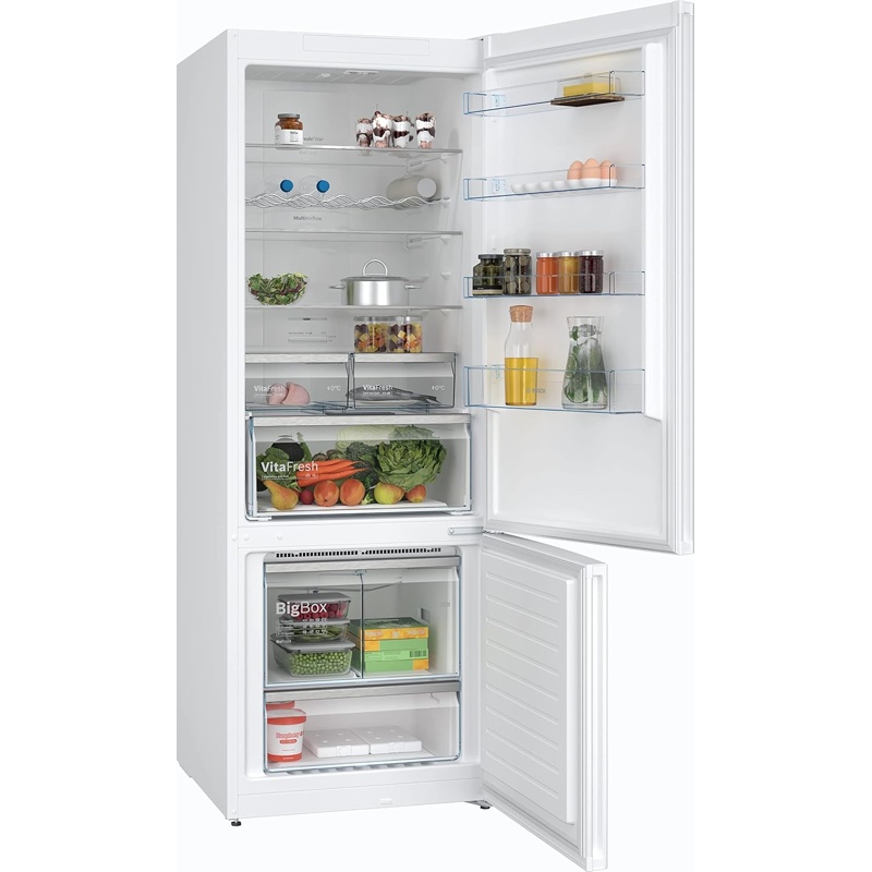 Frigorífico combinado Bosch modelo KGN56XWEA con dos compartimentos en un mismo aparato: refrigeración y congelación. Capacidad total indicada: 400 L. Clasificación energética: D (según etiquetado energético de la UE vigente). Dimensiones exteriores indicadas: 193 cm de alto x 70 cm de ancho x 80 cm de fondo. Diseño de tipo combinado para almacenamiento de alimentos en zona de frío y zona de congelación, con funcionamiento mediante conexión a la red eléctrica. Referencia del producto: KGN56XWEA. Marca: Bosch.