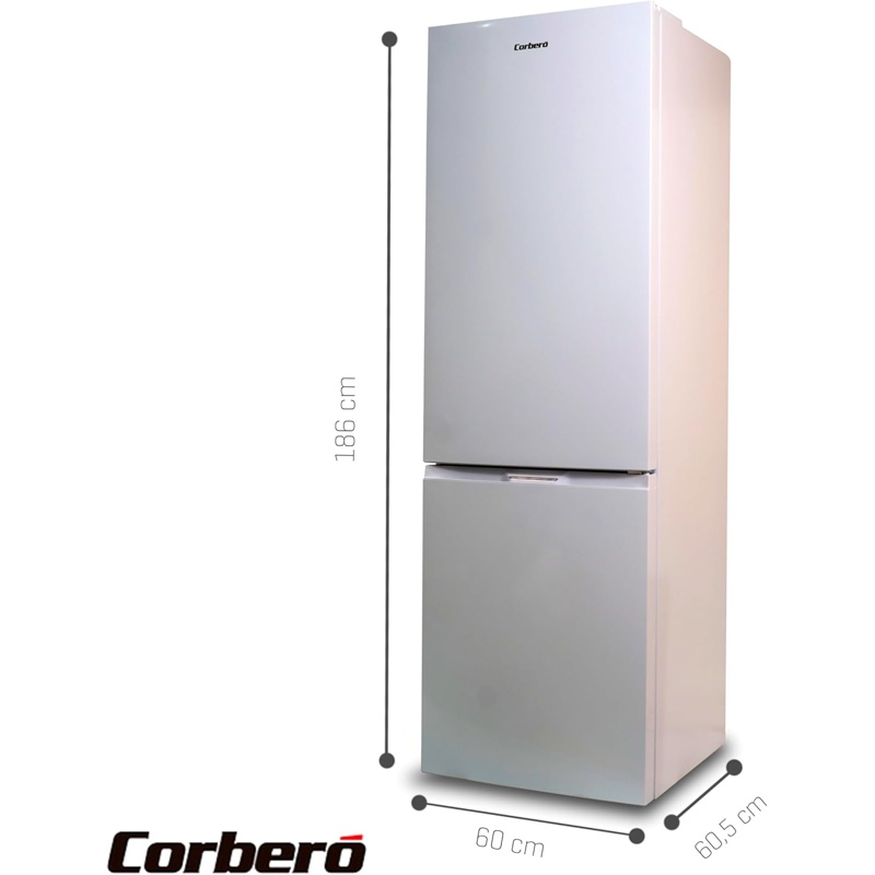 Frigorífico combinado Corberó CCH18564NFW con dos compartimentos separados para refrigeración y congelación. Capacidad total: 293 L. Dimensiones (ancho x fondo x alto): 59 x 91 x 177 cm. Nivel sonoro: 39 dB(A). Clasificación energética: D (según etiquetado energético de la UE). Diseño de tipo combi con puerta para cada compartimento. Equipo destinado al almacenamiento y conservación de alimentos mediante refrigeración y congelación con alimentación eléctrica.