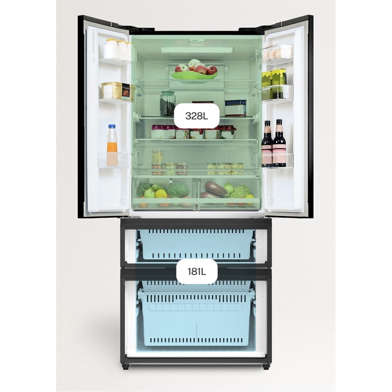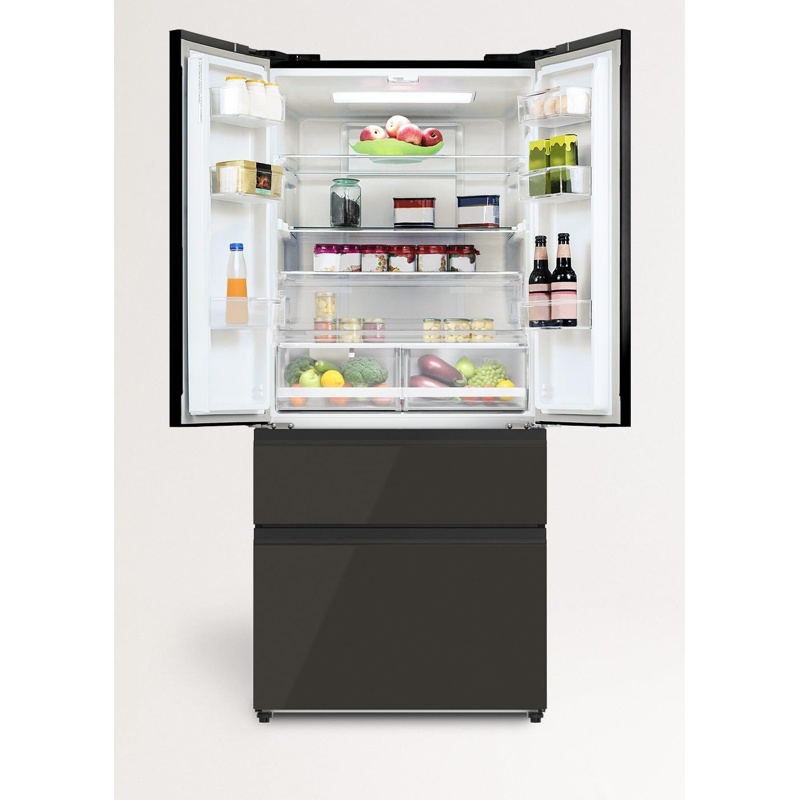 Frigorífico modelo FRIDGE STUDIO FRENCH DOOR PRO 509 fabricado por CREATE con estructura de cuatro puertas y compartimentos independientes para refrigeración y congelación. El aparato presenta una altura de 191,2 cm, anchura de 83,3 cm y profundidad de 63,5 cm. La capacidad total de almacenamiento es de 509 litros destinados a la conservación de alimentos refrigerados y congelados. El sistema de refrigeración es NoFrost. El equipo incorpora control electrónico táctil para la gestión de los ajustes de funcionamiento. La potencia eléctrica es de 160 W. Incluye modo de funcionamiento vacaciones dentro del sistema de control electrónico. El sistema interno incorpora tratamiento antibacteriano. La clasificación de eficiencia energética corresponde a la clase E conforme a la normativa (UE) 2017/1369. La estructura corresponde a una unidad vertical con compartimentos diferenciados para refrigeración y congelación dentro de un frigorífico de cuatro puertas.