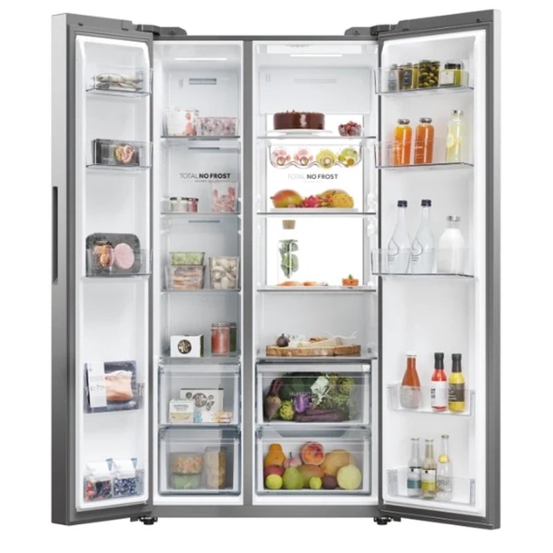 Frigorífico americano Haier HSW79F18ANMM de libre instalación con sistema de refrigeración No Frost y control electrónico de temperatura. Clase de eficiencia energética A con consumo anual de 143 kWh/año y nivel de ruido de 35 dB(A). Capacidad total de 611 litros, distribuida en 391 litros para el compartimento de refrigeración y 220 litros para el compartimento de congelación. Configuración side by side con dos puertas verticales y compartimentos independientes con acceso separado para cada zona. Sistema de circulación de aire con distribución interna en el compartimento frigorífico. Iluminación interior LED integrada. Clase climática SN-N-ST. Autonomía de conservación sin suministro eléctrico de 5 horas. Clasificación de congelador de 4 estrellas. Dimensiones del electrodoméstico: altura de 177,5 cm, anchura de 90,5 cm y profundidad de 71,8 cm. Distribución interna en varios niveles con regulación electrónica del funcionamiento del equipo.