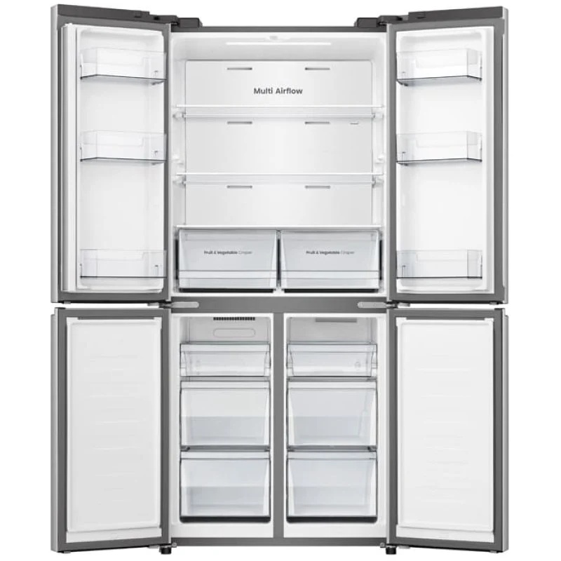 Frigorífico americano Hisense RQ5P470SEIE de instalación independiente con sistema de refrigeración No Frost y control electrónico de temperatura. Clase de eficiencia energética E con consumo anual de 293 kWh/año y nivel de ruido de 37 dB(A). Capacidad total neta de 499 litros, distribuida en 403 litros para el compartimento de refrigeración y 179 litros para el compartimento de congelación. Configuración con múltiples puertas y compartimentos independientes para refrigeración y congelación. Conectividad WiFi compatible con red inalámbrica para control mediante aplicación. Sistema de circulación de aire con distribución interna para el flujo de frío. El compartimento frigorífico incorpora estantes y cajones para la organización interna, mientras que el congelador dispone de compartimentos diferenciados para almacenamiento de productos congelados. Distribución interna en varios niveles con regulación electrónica del funcionamiento del equipo.