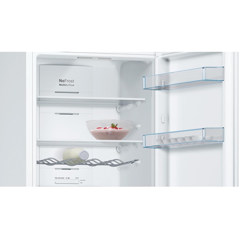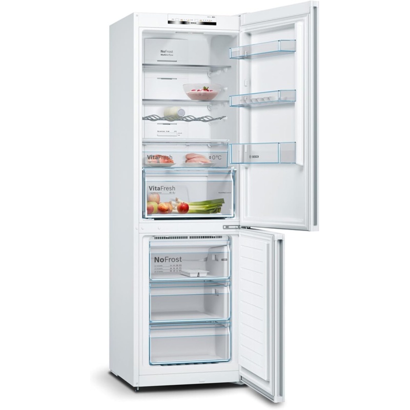 Frigorífico combi Bosch KGN36VWDB de libre instalación con compartimento frigorífico y compartimento congelador para almacenamiento de alimentos a distintas temperaturas. Clase de eficiencia energética D según la clasificación europea. Sistema de frío Total No Frost. Altura de 186 cm, anchura de 60 cm y profundidad de 66 cm. Configuración vertical con dos compartimentos independientes accesibles mediante puertas frontales. El interior incluye estantes, cajones y compartimentos destinados a la organización de alimentos refrigerados y productos congelados. El compartimento frigorífico incorpora compartimento VitaFresh destinado al almacenamiento de alimentos frescos. Funcionamiento mediante conexión a red eléctrica doméstica. Estructura exterior con acabado en color blanco y configuración destinada a instalación independiente.