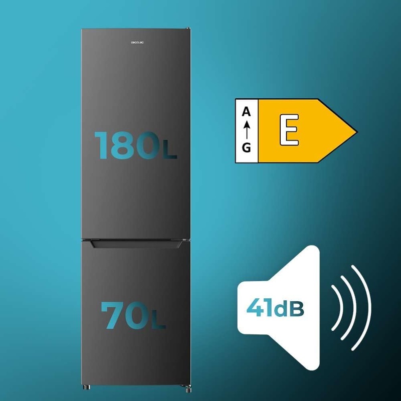 Frigorífico combi modelo Bolero CoolMarket Combi 250 fabricado por Cecotec con compartimentos independientes para refrigeración y congelación. El aparato presenta una altura de 180 cm y una anchura de 55 cm. La capacidad total es de 250 litros destinados al almacenamiento de alimentos refrigerados y congelados. La clasificación de eficiencia energética corresponde a la clase E conforme a la normativa europea de etiquetado energético. El sistema de refrigeración utiliza tecnología Total NoFrost. El sistema de circulación de aire incorpora tecnología Multi Air Flow para distribución del aire dentro del compartimento de refrigeración. El interior incluye un cajón Humidity Box con regulación de humedad. El sistema de control incorpora función Fast Cooling. El aparato dispone de alarma de apertura de puerta y señal de fallo de funcionamiento dentro del sistema de control electrónico. La estructura corresponde a una unidad vertical con compartimento superior de refrigeración y compartimento inferior de congelación dentro de un frigorífico combinado de instalación independiente.