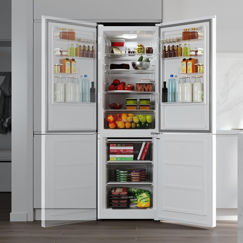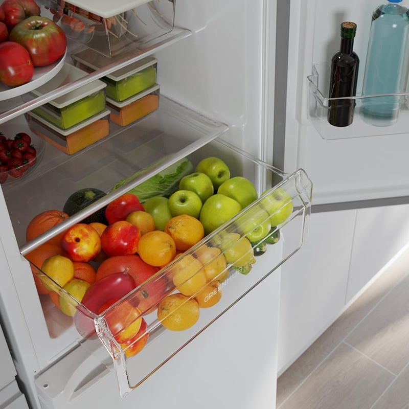Frigorífico combi modelo Bolero CoolMarket Combi 296 DF fabricado por Cecotec con compartimentos independientes para refrigeración y congelación. El aparato presenta una anchura de 60 cm y un volumen total de 296 litros destinados al almacenamiento de alimentos refrigerados y congelados. La clasificación de eficiencia energética corresponde a la clase E conforme a la normativa europea de etiquetado energético. El sistema de control incluye funciones FastCooling y FastFreezing para gestión de la temperatura en los compartimentos. El sistema de descongelación incorpora función DeFrost dentro del circuito de funcionamiento. El interior del compartimento de refrigeración dispone de iluminación mediante sistema LED integrado. El aparato corresponde a una unidad vertical de instalación independiente con compartimento superior de refrigeración y compartimento inferior de congelación destinados al almacenamiento de alimentos refrigerados y congelados.