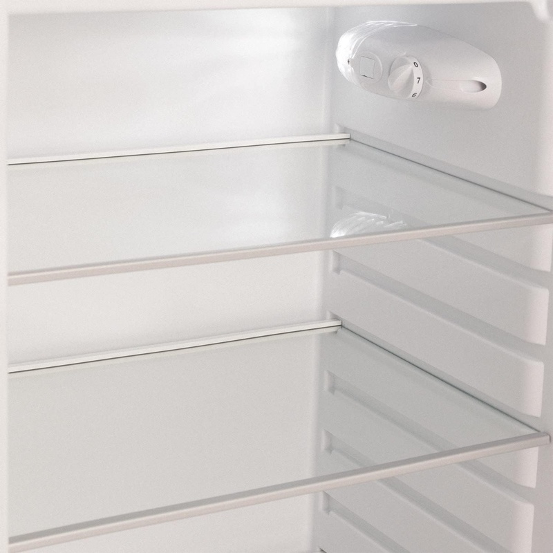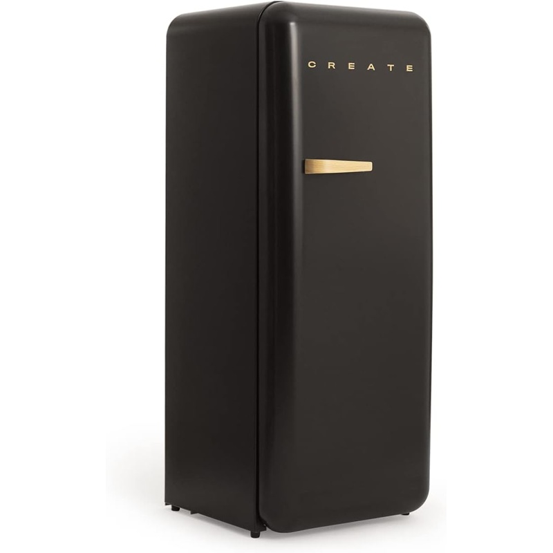 Frigorífico modelo RETRO FRIDGE 150 fabricado por CREATE con compartimentos independientes para refrigeración y congelación. El aparato presenta una altura de 150 cm, anchura de 60 cm y profundidad de 60 cm. La capacidad total de almacenamiento es de 281 litros destinados a la conservación de alimentos refrigerados y congelados. La potencia eléctrica es de 102 W. La clasificación de eficiencia energética corresponde a la clase D conforme a la normativa europea de etiquetado energético. El compartimento de refrigeración incluye tres estantes intercambiables de vidrio templado y un estante fijo para organización interna. El equipo incorpora un botellero, un cajón destinado a almacenamiento de frutas y verduras y cuatro repisas laterales intercambiables en la puerta. El aparato dispone de regulador de temperatura integrado en el sistema de control interno. La estructura corresponde a una unidad vertical con compartimento de congelación integrado.