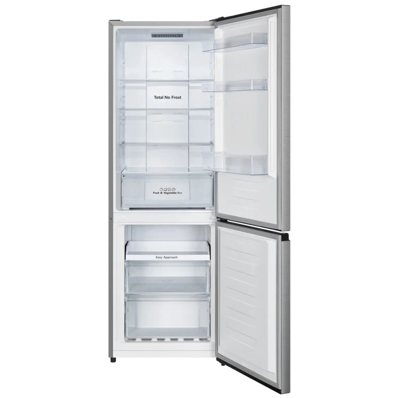 Frigorífico combi Hisense RB372N4ACE con sistema de refrigeración No Frost y control electrónico de temperatura. Clase de eficiencia energética E y nivel de ruido de 39 dB(A). Capacidad útil total de 292 litros con compartimentos independientes para refrigeración y congelación. Configuración combi con dos puertas y acceso separado para cada zona. Puerta reversible para instalación con apertura en ambos sentidos. El compartimento frigorífico incorpora estantes y cajones para la organización interna, mientras que el congelador dispone de compartimentos diferenciados para almacenamiento de productos congelados. Dimensiones del electrodoméstico: altura de 179 cm, anchura de 60 cm y profundidad de 59 cm. Distribución interna en varios niveles con separación de zonas y regulación electrónica del funcionamiento del equipo.