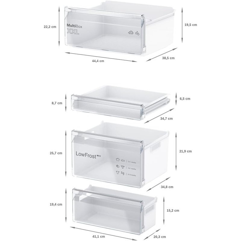 Frigorífico combi integrable Bosch KIV86NSE0 con volumen total de 267 L distribuido entre compartimento frigorífico y compartimento congelador con posición inferior. Clase de eficiencia energética E según la clasificación europea. Configuración vertical con dos compartimentos independientes destinados al almacenamiento de alimentos refrigerados y productos congelados. El acceso se realiza mediante puertas frontales integradas en el mueble de cocina. El interior incluye estantes, cajones y compartimentos destinados a la organización de alimentos. El compartimento frigorífico está destinado al almacenamiento de alimentos frescos y el compartimento congelador al almacenamiento de productos congelados. Funcionamiento mediante conexión a red eléctrica doméstica. Configuración diseñada para instalación integrable en muebles de cocina. Estructura exterior en color blanco.