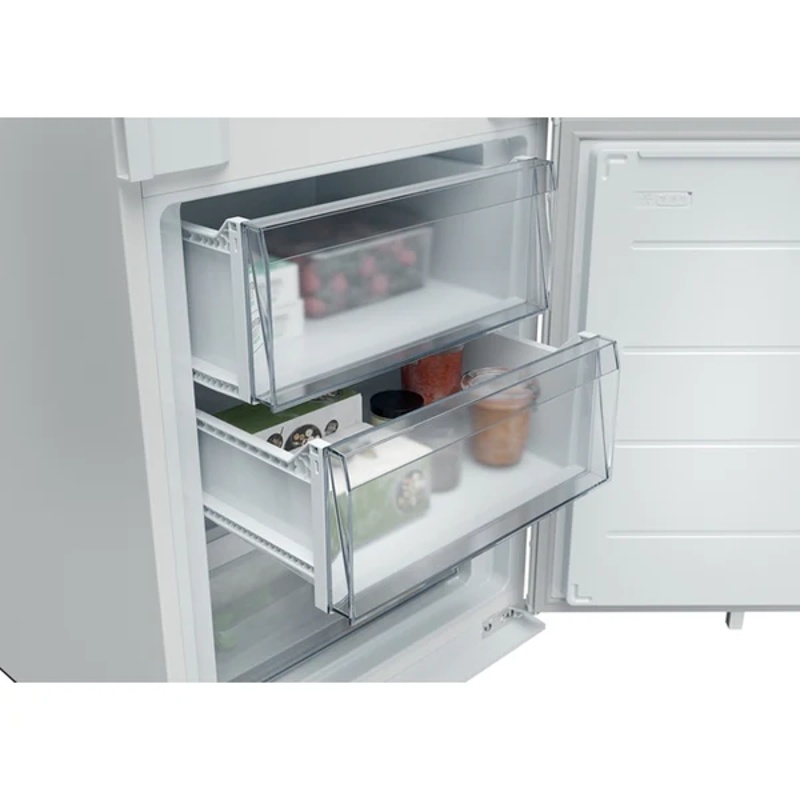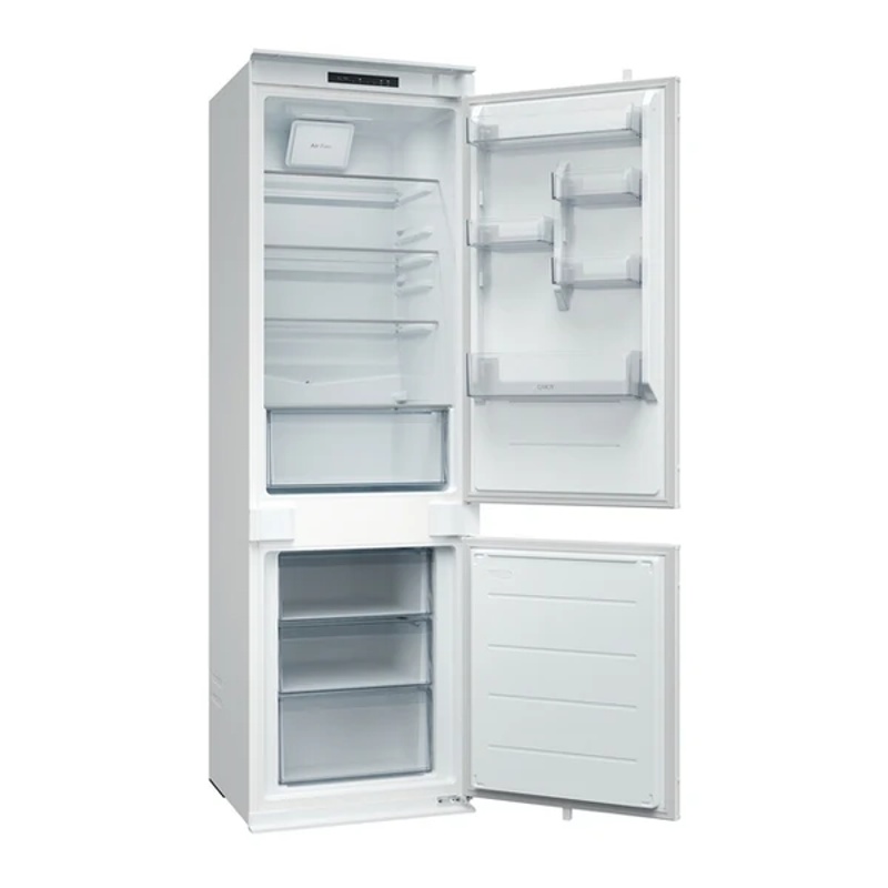 Frigorífico combi integrable Candy CNBQL3518EV con volumen total de 268 L distribuido entre compartimento frigorífico y compartimento congelador para almacenamiento de alimentos a distintas temperaturas. Clase de eficiencia energética E según la clasificación europea dentro del rango de A a G. Dimensiones de 177,2 cm de altura, 54 cm de anchura y 55 cm de profundidad. Sistema de frío Low Frost. Configuración vertical con dos compartimentos independientes accesibles mediante puertas integradas en el mueble de cocina. El interior incluye estantes, balconeras en la puerta y cajones destinados a la organización de alimentos refrigerados y productos congelados. Sistema de control interno para ajuste de temperatura. Funcionamiento mediante conexión a red eléctrica doméstica. Configuración destinada a instalación integrable. Estructura exterior con acabado en color blanco.