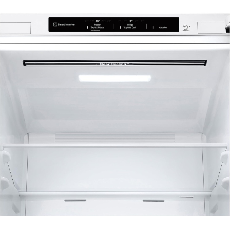 Frigorífico combi LG GBV3100DSW de libre instalación con volumen total de 374 L distribuido entre compartimento frigorífico y compartimento congelador. Clase de eficiencia energética D según la clasificación europea dentro del rango de A a G. Dimensiones de 186 cm de altura, 59,5 cm de anchura y 68,2 cm de profundidad. Sistema de frío Total No Frost. Sistema DoorCooling para circulación de aire en el interior del compartimento frigorífico. Configuración vertical con compartimentos independientes para refrigeración y congelación accesibles mediante puertas frontales. El interior incluye estantes, balconeras en la puerta y cajones destinados a la organización de alimentos refrigerados y productos congelados. Funcionamiento mediante conexión a red eléctrica doméstica. Configuración destinada a instalación independiente. Estructura exterior con acabado en color blanco.