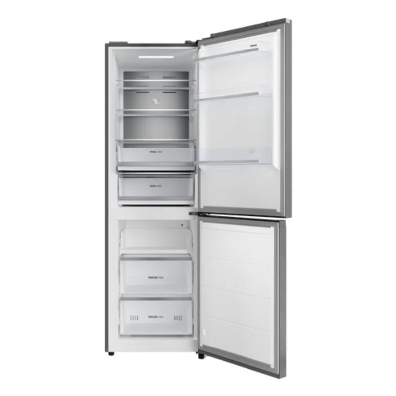 Frigorífico combi Teka RBF64660SS de libre instalación con control electrónico de temperatura. Clase de eficiencia energética C. Capacidad neta total de 338 litros, distribuida en 176 litros para el compartimento de refrigeración y 118 litros para el compartimento de congelación. Configuración con dos compartimentos independientes y acceso mediante puertas separadas. Clase climática SN-T. El compartimento frigorífico incorpora estantes y cajones para la organización interna, mientras que el congelador dispone de compartimentos diferenciados para almacenamiento de productos congelados. Dimensiones del electrodoméstico: altura de 185 cm, anchura de 59,5 cm y profundidad de 70 cm. Peso del aparato de 76 kg. Distribución interna en varios niveles con separación de zonas para refrigeración y congelación y regulación electrónica del funcionamiento del equipo.