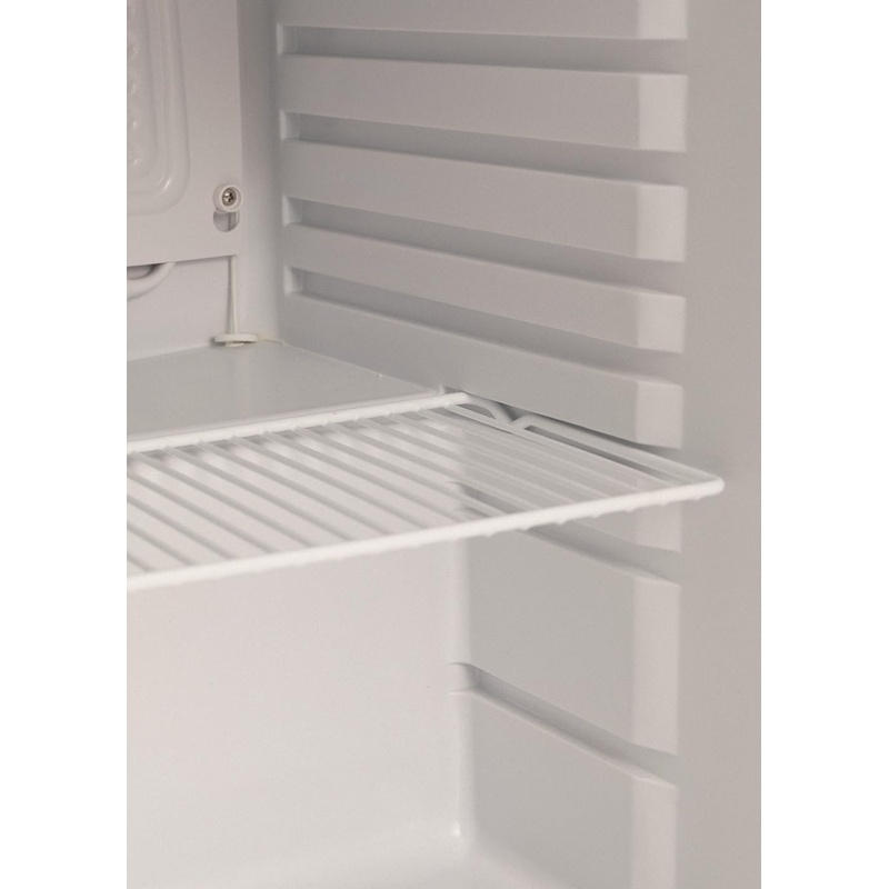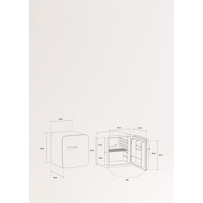 Frigorífico modelo RETRO FRIDGE 50 fabricado por CREATE con un compartimento de refrigeración. El aparato presenta una altura de 50 cm, anchura de 44 cm y profundidad de 49,8 cm. El compartimento de refrigeración dispone de una capacidad útil de 48 litros destinada al almacenamiento en frío. El nivel de emisión acústica es de 39 dB(A). La clasificación de eficiencia energética corresponde a la clase F según la normativa (UE) 2017/1369. La estructura interna incluye un estante y dos repisas para organización del espacio dentro del compartimento de refrigeración. El aparato corresponde a una unidad con instalación independiente y puerta frontal. El modelo RETRO FRIDGE 50 pertenece a la categoría de frigoríficos con un único compartimento de refrigeración dentro de una estructura compacta.