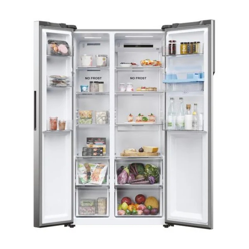 Frigorífico Side by Side Haier modelo HSR5918DWMP con ancho de 90 cm y capacidad total de 521 L. Configuración side by side con dos puertas verticales y dos compartimentos en paralelo: uno de refrigeración y otro de congelación, accesibles de forma independiente. Equipo destinado al almacenamiento de alimentos a temperatura de refrigeración y de congelación, con separación física entre ambos espacios. Clasificación energética D. Identificación del producto por marca Haier y referencia HSR5918DWMP, adecuada para catálogos y reposición de repuestos compatibles con el modelo. Capacidad indicada en litros para el conjunto del aparato y formato de 90 cm de ancho para instalación en espacios con esa medida disponible.